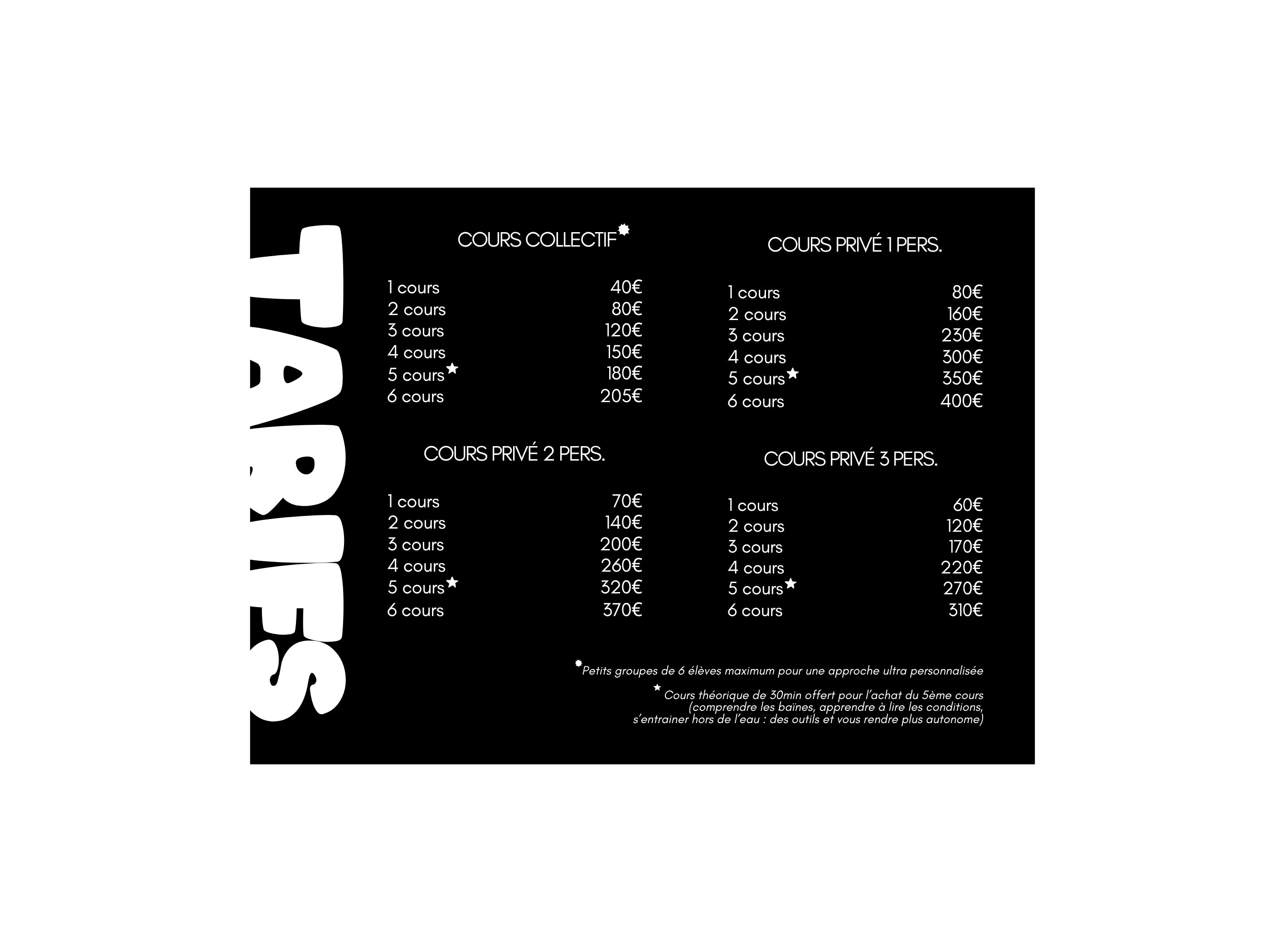 Les horaires sont fixés la veille pour le lendemain en fonction des marées et des prévisions météorologiques. Il se peut qu'un cours s'annule en cas de trop mauvaises conditions. Vous en serez averti au plus tôt.
